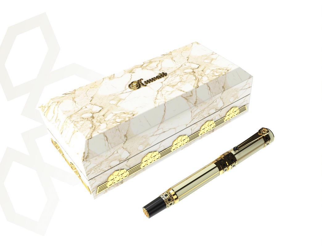 نحاس مطلي بالذهب مع رسومات محفورة والعلبة مصنوعة من الخشب ومطلية بالجلد حجم القلم: 1.5 × 14.5 × 2 سم حجم الصندوق: 8.5 × 18 × 5.4 سم